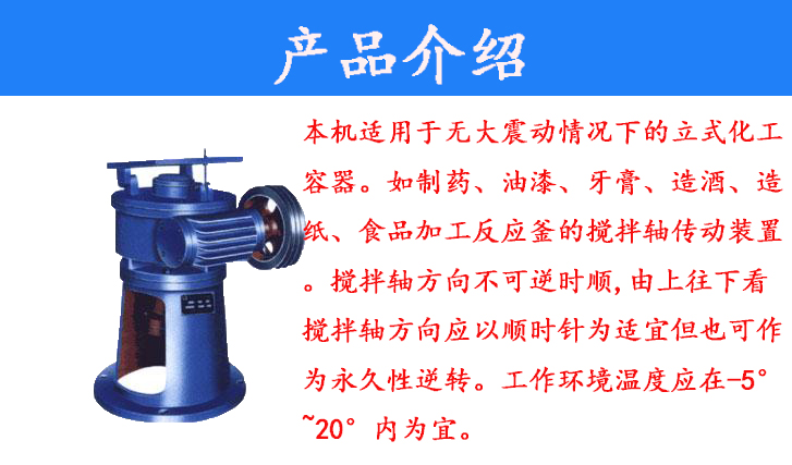 本機適用于無大震動情況下的立式化工容器。如制藥、油漆、牙膏、造酒、造紙、食品加工反應釜的攪拌軸傳動裝置。攪拌軸方向不可逆時順,由上往下看攪拌軸方向應以順時針為適宜但也可作為永久性逆轉。工作環境溫度應在-5°~20°內為宜。