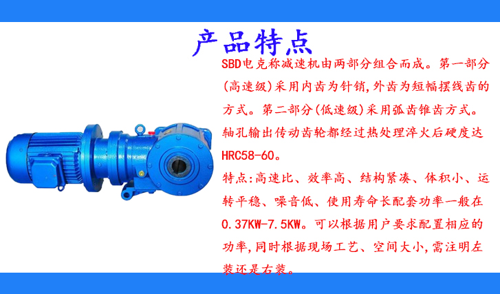 SBD電克稱減速機(jī)由兩部分組合而成。第一部分(高速級)采用內(nèi)齒為針銷,外齒為短幅擺線齒的方式。第二部分(低速級)采用弧齒錐齒方式。軸孔輸出傳動齒輪都經(jīng)過熱處理淬火后硬度達(dá)HRC58-60。