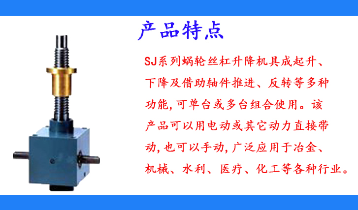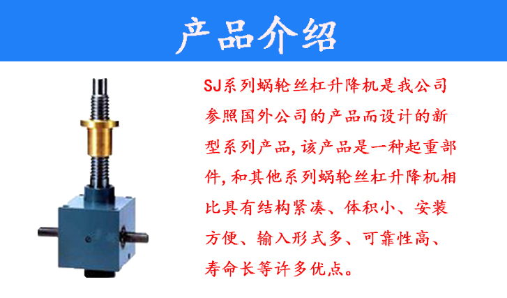 SJ系列蝸輪絲杠升降機具成起升、下降及借助軸件推進、反轉等多種功能,可單臺或多臺組合使用。該產品可以用電動或其它動力直接帶動,也可以手動,廣泛應用于冶金、機械、水利、醫療、化工等各種行業。