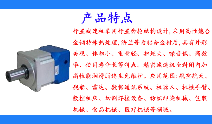 精密行星減速機(jī)最大特點(diǎn)為高精度,傳遞能力大,當(dāng)然也可以配直流電機(jī)、單相電機(jī)、同步電機(jī)及各類三相異步電機(jī)等動(dòng)力源。