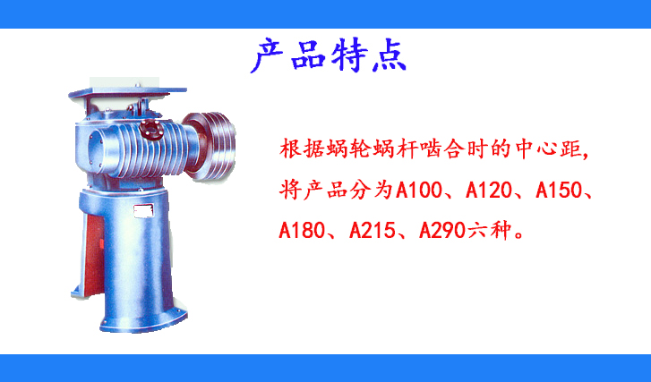 A型減速機及支架■產品簡介結構緊湊,傳動比大,工作平穩可靠、噪音低,在蝸桿螺線導程角小的情況下減速機還具有自鎖性。■產品特點根據蝸輪蝸桿嚙合時的中心距,將產品分為A100、A120、A150、A180、A215、A290六種。