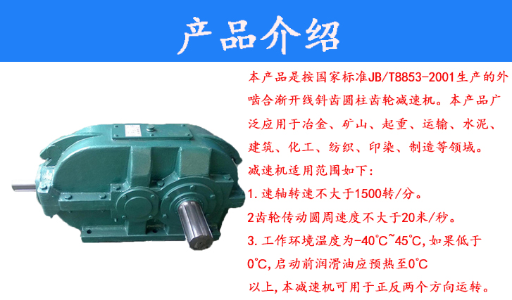 DBY、DCY、DFY系列減速器分別為二級傳動、三級傳動和四級傳動的輸入、輸出軸位于垂直狀態的外嚙合齒輪傳動機構,符合JB/T8853-1999標準。可取代SS型垂直軸減速器和ZQ、ZL、等舊型號減速器,亦可替代同類型國外進口減速器。