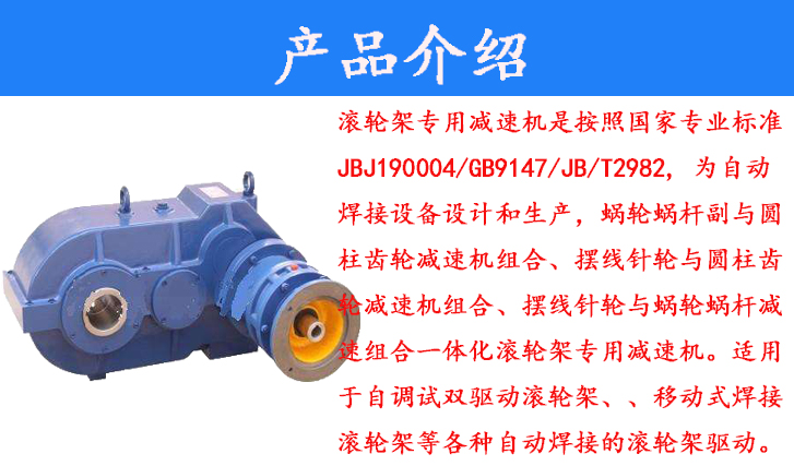 滾輪架專用減速機是按照國家專業標準JB19004/GB9147/JB/T2982,為自動焊接設備設計和生產的,蝸輪蝸桿副與圓柱齒輪減速機組合、擺線針輪與圓柱齒輪減速機組合,擺線針輪與蝸輪蝸桿減速組合一體化滾輪架專用減速機。適用于自調式雙驅動滾輪架、移動式焊接滾輪架等各種自動焊接的滾輪架驅動。