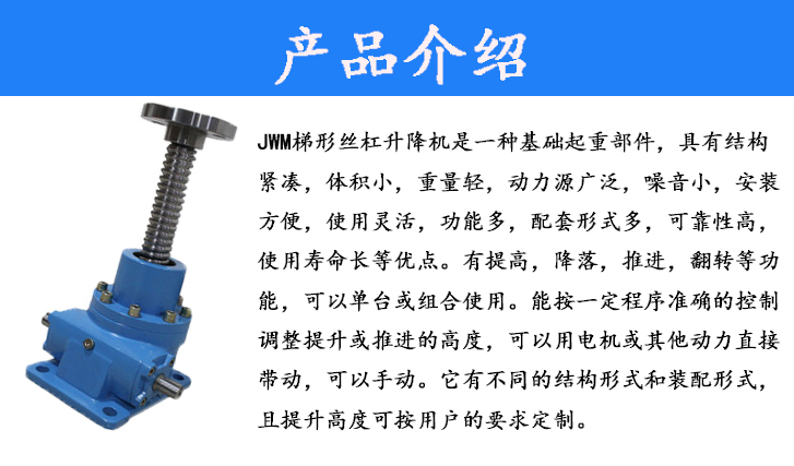 1、JWM型(梯形絲杠型)適用于低速、低頻率的場合,主要構成部件為:精密梯形絲杠副與高精密度蝸輪蝸桿副。