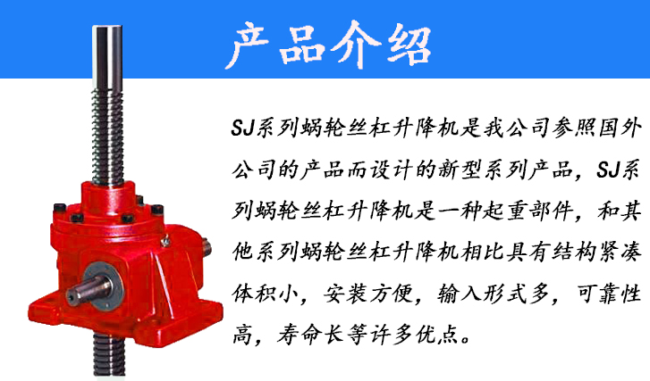 SJ系列蝸輪絲杠升降機是我公司參照國外公司的產品而設計的新型系列產品,該產品是一種起重部件,和其他系列蝸輪絲杠升降機相比具有結構緊湊、體積小、安裝方便、輸入形式多、可靠性高、壽命長等許多優點。