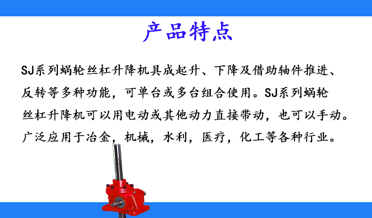 SJ系列蝸輪絲杠升降機具成起升、下降及借助軸件推進、反轉等多種功能,可單臺或多臺組合使用。