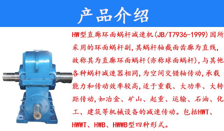 HW型直廊環(huán)面蝸桿減速機(jī)(JB/T7936-1999)因所采用的環(huán)面蝸桿副,其蝸桿軸截面齒廓為直線,故稱其為直廓環(huán)面蝸桿(亦稱球面蝸桿),與其他各種蝸桿減速器相同,為空間交錯軸傳動,承載能力和傳動效率較高,適用于重載、大功率、大轉(zhuǎn)距傳動,如冶金、礦山、起重、運(yùn)輸、石油、化工、建筑等機(jī)械設(shè)備的減速傳動。包括HWT、HWWT、HWB、HWWB型四種形式。