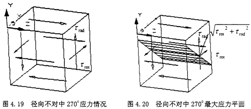 由圖示可知,此時單元體的受力其實(shí)是屬于純剪切狀態(tài),只是此時的剪切應(yīng)力為τrad與τrot的疊加。其分析過程與徑向不對中1800時的情況相似,只是這時τrad與τrot的方向相同,而在1800時方向相反,所以有