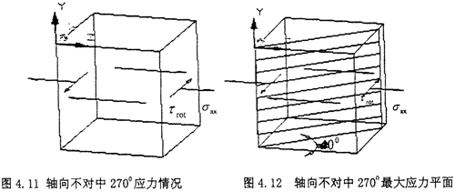 此時的受力由圖上可以看出,屬于空間應(yīng)力狀態(tài),其基本分析過程類似于徑向不對中900狀態(tài),現(xiàn)在將徑向不對中2700時的受力情況:σxx=0,σyy=0,σzz=0,τxy=-τrot,σyz=0,σzx=0,σzx=τrod分別代入式(4-29)(4-30)(4-31),得到
