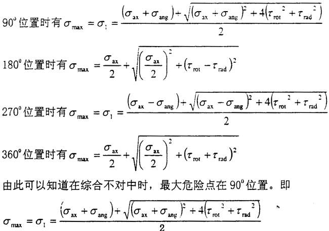 2.在徑向不對(duì)中時(shí),在給定的徑向不中量情況下,最大主應(yīng)力為發(fā)生在聯(lián)軸器360°位置,有σmax=+(τrot+τrad)。最大主應(yīng)力平面方向與y軸成45°夾角。即360°位置為徑向不對(duì)中時(shí)的危險(xiǎn)點(diǎn)。