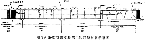 為了驗(yàn)證聯(lián)盟管道Φ914和Φ1067鋼管的止裂韌性,進(jìn)行了兩組全尺寸爆破實(shí)驗(yàn),實(shí)驗(yàn)管段全長約366m,中間為9根11m長的實(shí)驗(yàn)樣管,爆破實(shí)驗(yàn)時(shí)裂紋將在其中進(jìn)行擴(kuò)展。實(shí)驗(yàn)樣管沿東西方向分別標(biāo)為1E、2E以及1W、2W等,預(yù)制裂紋穿過1E和1W之間的環(huán)焊縫。第一次實(shí)驗(yàn)的示意圖如圖3-5所示。