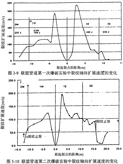 在圖3-8的所有實(shí)驗(yàn)中,裂紋以全延性方式向?qū)嶒?yàn)管兩端呈軸向擴(kuò)展,并突然轉(zhuǎn)向周向,隨即止裂。這表明管道本身的韌性導(dǎo)致止裂。