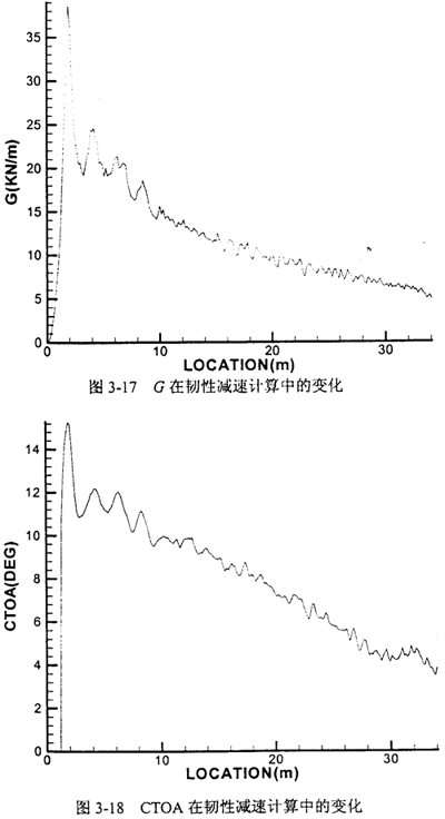 圖3-17和圖3-18是針對西氣東輸某特定設計參數的管線,應用韌性減速機理計算時能量釋放率G和裂紋尖端張開角CTOA的變化。