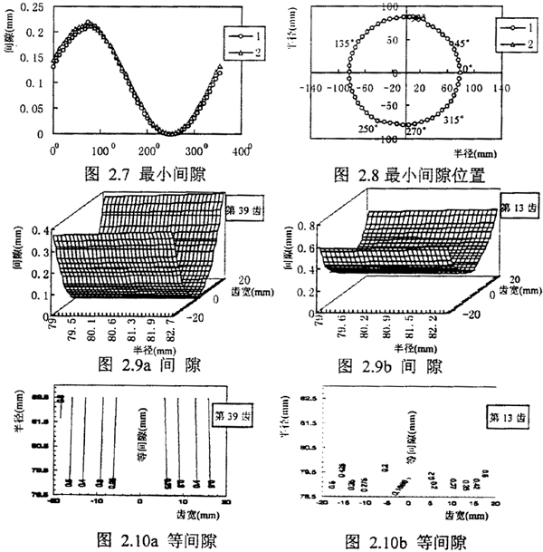 不失一般性設(shè)內(nèi)齒輪為主動輪外齒輪相對內(nèi)齒輪徑向位移Δx=-0.2mm,Δy=0.無載荷的情況下計算結(jié)果:圖2.7是內(nèi)齒旋轉(zhuǎn)一周時任意一對齒的最小間隙的變化或在任意的轉(zhuǎn)角0下各齒對的最小間隙。2.8 圖是半徑方向最小間隙所在的位置,由于外齒是鼓形齒且沒有偏角,在無載荷的情況下只在齒輪的中央齒廓處嚙合所以僅畫出半徑方向最小間隙位置。圖2.7 曲線1 是用本章方法計算的結(jié)果,曲線2 是用Heinz 幾何方法計算的結(jié)果,我們可以看出用兩種方法計算最小間隙的大小非常一致,但位置不同圖2.8 ,因為Heinz 方法僅規(guī)定內(nèi)外齒在分度圓上嚙合,本文是從全齒高嚙合狀態(tài)來考慮最小間隙及其位置的。圖2.7中250° 近間隙為零,即在無載荷或輕載荷時內(nèi)外齒輪在此處附近的對齒嚙合,相應(yīng)圖2.8 在250°嚙合處的縱坐標大致為基圓的半徑,即嚙合線與基圓相切并與△x 位移線平行,這與前面所說與零齒差齒輪嚙合相似;圖2.9, 2.10 是在θ=0時第39 齒(圖a)和第13齒(圖b)的齒面間隙和等間隙曲線,從圖中可以看出最小間隙在齒寬的中央,這是因內(nèi)外齒沒有發(fā)生相對轉(zhuǎn)角位移,而且間隙沿齒高方向間隙變化的梯度小,即分度圓上的間隙與齒高方向的間隙相關(guān)很小,而沿著齒輪軸向的間隙變化的梯度較大,等間隙曲線沿軸向分布呈帶狀,這也是Heinz和本文計算最小間隙大小相近的原因。