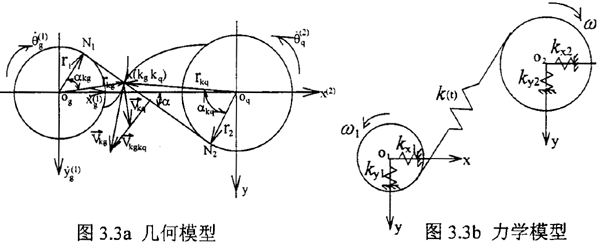 在以往對外齒輪模型簡化時(shí)主要采用兩種方法如圖3.3a、3.3b幾何模型和力學(xué)模型。在幾何耦合模型中,齒輪輪齒被視為剛體。假定:1.嚙合過程中輪齒始終保持接觸,不脫嚙。2.嚙合線方向保持不變。要滿足假設(shè)1,按兩齒輪接觸表面法向速度相等原則: