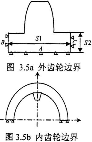 對于外齒輪Daimler-Benz公司選取邊界的方法是先取半個(gè)齒輪進(jìn)行有限無計(jì)算,這是從整體來考慮問題,然后根據(jù)計(jì)算的結(jié)果來選擇邊界的范圍,其所定的邊界寬度如圖3.5a,S1=6.1m,m是齒輪的模數(shù)。Chaber所取的邊界的方法是考慮圣維需原理,其所定的邊界深度為S2=1.5m。綜合以上兩者的研究,用有限無計(jì)算外齒的變形,計(jì)算模型的邊界范圍可取: