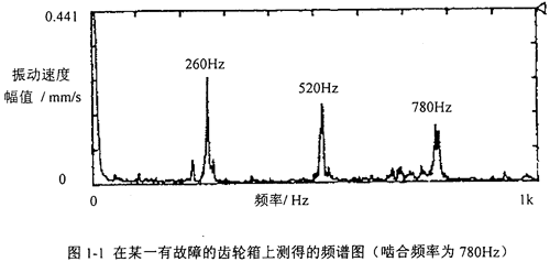 齒輪在傳動過程中,輪齒是不斷地處在一齒與兩齒交替咬合狀態,對于斜齒輪,是不斷地處在兩齒與三齒交替咬合狀態。當齒側有間隙時,此時的振動體系是時變的非線性系統;輪齒間隙過大時還會出現瞬時脫齒狀態。因此,齒輪所產生的振動除了和輪齒嚙合剛度時變性有關外,還和齒輪的制造誤差(如質量偏心、齒距偏差和齒形誤差)、裝配不良(如兩個齒輪軸心線不平行)、齒輪正常損傷(如齒輪正常磨損等)和齒輪非正常損傷(如齒面疲勞點蝕、齒面剝落、齒面燒傷、塑性變形和膠合撕傷等)有關。人們一般都認為,齒輪在振動時其振動故障頻率為齒輪嚙合頻率的n倍(n=l,2,3,…),但實際情況并不完全如此,如在圖1-1中,齒輪振動故障頻率為齒輪嚙合頻率的1/3、2/3和3/3倍,振動速度的幅值也較齒輪正常時大一些;在另外一些場合,齒輪振動故障頻率為n/m倍(n,m皆為正整數)。因此很有必要對產生分數倍亞諧和超諧振動的原因作深入的研究工作。