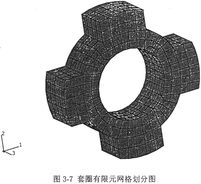 套圈是一個不規(guī)則的零件,先用有限元按三維八節(jié)點實體單元對它進行網格劃分,圖3-7是有限元網格劃分圖。邊界條件是這樣處理的:由于套圈裝在減速機箱體孔中時,和孔的配合是過盈配合,且套圈內表面與傳動軸外表面也是過盈配合,故套圈的配合面處均按固支對待。經ABAQUS有限元軟件處理后輸出質量矩陣和剛度矩陣,然后用廣義的Collatz包含定理求出它的低階固有頻率。