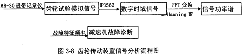 圖3-8是齒輪傳動裝置信號分析流程圖,用HP3562動態(tài)數字分析儀采集MR-30磁帶記錄儀紀錄的二級圓柱斜齒輪減速機試驗過程中的模擬信號,可得到齒輪傳動裝置載荷、齒輪傳動裝置箱體動態(tài)激勵力應變變化的時域信號,對此信號作FFT變換,可得到載荷譜和動態(tài)激勵力應變變化時域信號的功率譜。為了防止功率譜泄露,在作FFT變換時,需作加窗處理,由于試驗采集的是隨機信號,故加漢寧(Hanning)窗處理。利用故障診斷特征參數-傳動零件可能發(fā)生故障的振動頻率及其振動頻率處的功率對試驗信號進行診斷分析。當功率譜所包含的頻率成份難以區(qū)分時,可采用倒譜分析。