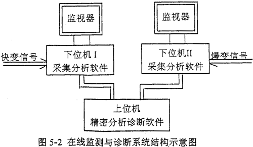 為了適應(yīng)日益更新的生產(chǎn)實際多種類型參數(shù)監(jiān)測和故障診斷的要求,建立由多臺微機(jī)并行運行構(gòu)成的在線連續(xù)實時監(jiān)測與快速診斷系統(tǒng)。圖5-2為多微機(jī)在線監(jiān)測與診斷系統(tǒng)結(jié)構(gòu)示意圖。這樣做的優(yōu)點是: