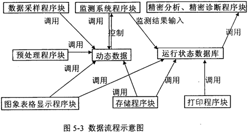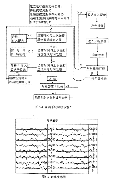 軟件的各個模塊通過動態(tài)數(shù)據(jù)和運行狀態(tài)數(shù)據(jù)庫聯(lián)系在一起,在下位機(jī)中,監(jiān)測系統(tǒng)控制著動態(tài)數(shù)據(jù)的采集、存儲、顯示和預(yù)處理,同時把監(jiān)測結(jié)果存入各機(jī)組運行狀態(tài)特征數(shù)據(jù)庫。在上位機(jī)中,詳細(xì)分析診斷程序塊調(diào)用運行狀態(tài)數(shù)據(jù)庫,得出診斷結(jié)果并調(diào)用打印程序塊輸出。圖5-3為數(shù)據(jù)流程示意圖,圖5-4為監(jiān)測系統(tǒng)流程示意圖。