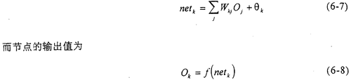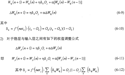 對于圖6-1所示的網絡,其訓練學習的過程包括:1)網絡內部的前向計算;2)誤差的反向傳播。其主要目的就是通過逐步調整網絡的內部連接權值,使網絡的均方誤差達到我們的要求。網絡內部的連接權值的調整,都是采用推廣的δ規則來完成的。