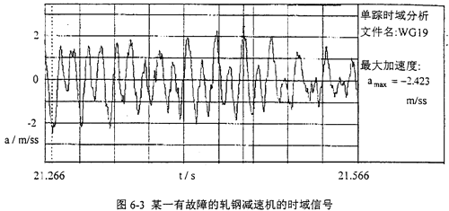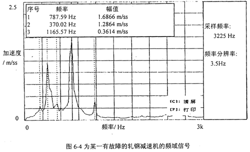 由于減速機故障樣式的多樣性,故它的故障標準模式樣本的建立是比較困難的,需進行大量的試驗研究和實際設備故障診斷的總結和歸納。表6-5是在參考其它學者研究成果的基礎上,總結設備具體工作情況得出的減速機的故障標準模式樣本,表6-6為減速機標準訓練樣本的訓練結果(網絡規模為:輸入層節點數為:9個;一個隱層節點數為:40個;輸出層節點數為9個;誤差精度為10-5,網絡迭代次數為5217次)。圖6-3為某一有故障的軋鋼減速機的時域信號,圖6-4為頻域信號。對圖6-4的頻域信號進行歸一化處理,可得待識別的故障樣本,用訓練好的網絡對該樣本進行識別。表6-7為該減速機故障樣本的識別結果。fa一軸頻,f0一軸承外圈故障特征頻率,fi一軸承內圈故障特征頻率,fb一軸承滾動體故障特征頻率,fmeh一齒輪嚙合頻率。