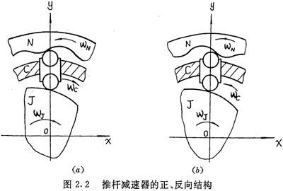 在推桿減速器中,設(shè)激波器按順時(shí)針?lè)较蛐D(zhuǎn),則傳動(dòng)圈C,內(nèi)齒圈N的轉(zhuǎn)向可能與激波器相同,也可能相反(圖2.2)。為了研究問(wèn)題的方便,本文中稱傳動(dòng)圈與主動(dòng)件激波器轉(zhuǎn)向相同的結(jié)構(gòu)為正向結(jié)構(gòu)(圖2.2(a)),稱傳動(dòng)圈與激波器轉(zhuǎn)向相反的結(jié)構(gòu)為反向結(jié)構(gòu)(圖2.2(b))。