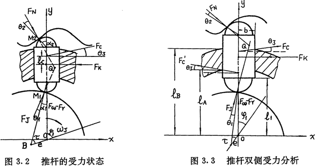 若傳動(dòng)圈尺寸選用不當(dāng),或者是機(jī)構(gòu)為反向結(jié)構(gòu),使FJ與FN作用力的交點(diǎn)Q落在傳動(dòng)圈所在環(huán)外(圖3.3所示)時(shí),推桿呈現(xiàn)雙側(cè)受力狀態(tài)。生產(chǎn)實(shí)踐表明,推桿雙側(cè)受力將造成推桿嚴(yán)重的磨損。這種情況下推桿的受力與傳動(dòng)圈外徑尺寸有關(guān)。對于圖3.3所示受力情況,對推桿質(zhì)心取矩,可列出它的平衡方程式為: