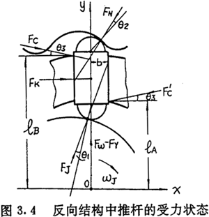 在傳動(dòng)圈與激波器轉(zhuǎn)向相反的結(jié)構(gòu)中,工作推桿的受力狀誠如圖3.4所示。從受力狀態(tài)圖可以看出,在運(yùn)動(dòng)過程中,推桿與導(dǎo)槽必然形成雙側(cè)接觸。推桿兩側(cè)將造成嚴(yán)重磨損,實(shí)際生產(chǎn)中,應(yīng)避免使用反向結(jié)構(gòu)。