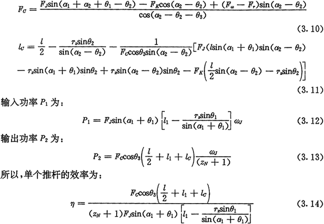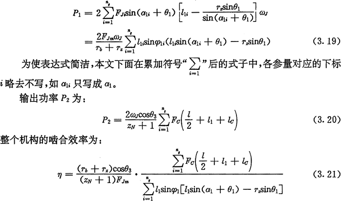 計(jì)算時(shí),先根據(jù)輸入功率P1及轉(zhuǎn)速ωJ由(3.19)式計(jì)算出FJm,然后對每一工作推桿由式(3.17)計(jì)算出FJi,由式(3.10)式及式(3.11)計(jì)算出Fci及l(fā)ci,最后代入式(3.21)計(jì)算出效率η。