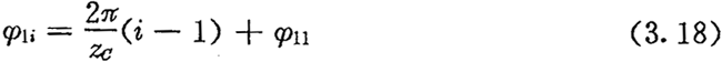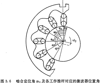 由于相鄰兩推桿所夾的中心角為2π/ZC,在某一時(shí)刻,只要其中一個(gè)工作推桿所對應(yīng)的激波器位置角(激波器相對該推桿從初始工作位置轉(zhuǎn)過的角度φ1)確定后,其它各工作推桿所對應(yīng)的激波器位置角也隨之確定下來。設(shè)各工作推桿所對應(yīng)的最小激波器位置角為φ11,如圖3.6所示,則從對應(yīng)激波器位置角為φ11的這個(gè)工作推桿開始,順序第i個(gè)工作椎桿所應(yīng)的激波器位置角φ1i為: