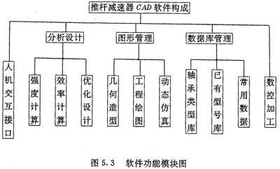 軟件主要由分析設計、圖形管理、數據庫管理及摟控加工四大部分組成,并提供了一個友好的人機交互接口界面用于實現漢字人機對話。本交互接口由三級推拉彈出式菜單組成。軟件模塊結構如圖5.3所示。各大模塊的主要功能及特點如下: