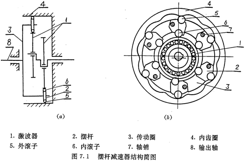 文獻只提出了擺桿活齒傳動的一般結(jié)構(gòu)方案,要把這種方案變?yōu)閷嶋H產(chǎn)品,還有許多理論問題需要解決。例如對機構(gòu)傳動特性的分析,效率計算,強度校核,以及內(nèi)齒圈齒廓的測量等等。本章從擺桿減速器的傳動原理著手,對這些問題進行了詳細的分析討論,為擺桿減速器的制造奠定了理論基礎。