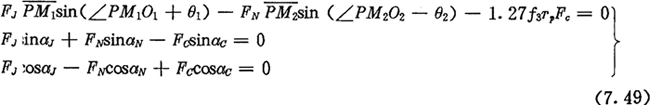 在方程組織(7.49)中,當激波器轉角φ1確定后,除FJ、FN、FC及αC外,其它各量都相應按前述公式有了確定的數值。其中摩擦角θ1、θ2及摩擦系數f3的取值,由選用的材料及潤滑情況決定。驅動力FJ可根據輸入功率求出,因而待求的未知數是FN、FC和αC