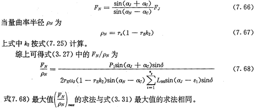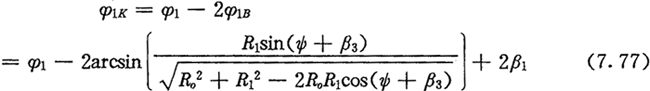 上式隱含地表達了αc與轉角φ1的關系,因而可從方程式(7.51)中解出αc來,αc的取值范圍是0~π。若解出的αc大于π/2時,表明圖7.7中Fc的方向為P點右上方指向P點。