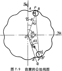 如圖7.9所示,AB是其中一個齒槽的一側齒廓,A′B′是跨教為K(圖中K=5)的一個齒槽的另一側齒廓。設內齒圈的齒廓曲線在圖示坐標系下可用方程式(7.9)來表示,現在來求齒廓AB及齒廓A′B′上具有的公法線。