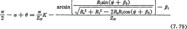 由式(7.71)及式(7.73)可得齒廓AB上與跨槽數為K的齒郭具有公法線的點的條件式為:
