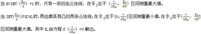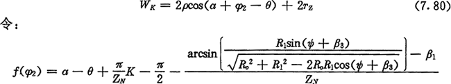 用選代法解方程(7.79),可得到齒廓AB上與跨槽數為K的齒廓A′B′具有公法線的點P所對應的外滾子位置角φ2,從而可行公法線長度WK為: