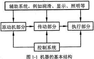 機(jī)器的發(fā)展經(jīng)歷了一個(gè)由簡(jiǎn)單到復(fù)雜的過程,人類為滿足生產(chǎn)及生活的需要,設(shè)計(jì)和制造出了種類繁多、功能各異的機(jī)器。機(jī)器類型多種多樣,基本結(jié)構(gòu)可以歸結(jié)為如圖1-l所示。機(jī)器的功能各異,所要求的運(yùn)動(dòng)形式千變?nèi)f化,并且需要克服的阻力、阻力矩也因機(jī)器工作情況而異。一般說來,原動(dòng)機(jī)的運(yùn)動(dòng)形式、運(yùn)動(dòng)及動(dòng)力參數(shù)都是有限的,而且是確定的。這樣必須解決把原動(dòng)機(jī)的運(yùn)動(dòng)形式、運(yùn)動(dòng)及動(dòng)力參數(shù)轉(zhuǎn)變?yōu)閳?zhí)行部分所需的運(yùn)動(dòng)形式、運(yùn)動(dòng)及動(dòng)力參數(shù)的問題。這就必須靠機(jī)器的傳動(dòng)部分來完成,即機(jī)器中的傳動(dòng)部分是機(jī)器為完成各種功能所必需的基本構(gòu)成。