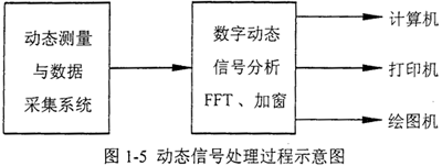 信號(hào)是動(dòng)態(tài)測(cè)量和動(dòng)態(tài)分析的對(duì)象。動(dòng)態(tài)測(cè)量和動(dòng)態(tài)分析的過程,實(shí)質(zhì)上就是信號(hào)采集、轉(zhuǎn)換、存貯和處理的過程,廣義上屬于信息論的范疇。動(dòng)態(tài)信號(hào)處理過程示意圖如圖1-5所示。