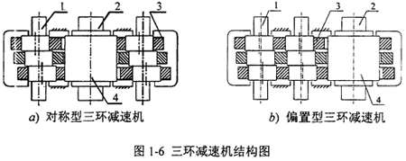 由于三環(huán)減速機(jī)的研究歷史較短,作為一種新生事物,它的發(fā)展道路也必定是曲折的。我國(guó)生產(chǎn)的三環(huán)減速機(jī)的結(jié)構(gòu)如圖1-6所示,a)是對(duì)稱型三環(huán)減速機(jī),b)是偏置型三環(huán)減速機(jī),三環(huán)減速機(jī)由兩根高速偏心輸入軸1,低速輸出軸2,三片為齒環(huán)板3和外齒輪4構(gòu)成。三片內(nèi)齒環(huán)板3偏心安裝在兩根高速軸1上,它們都與外齒輪4相嚙合,外齒輪4安裝在輸出軸上,各軸均平行配置,利用三相并列平行雙曲柄機(jī)構(gòu)來克服死點(diǎn)。雙曲柄機(jī)構(gòu)的最大缺點(diǎn)就是存在死點(diǎn)位置,即當(dāng)曲柄與連桿共線時(shí),機(jī)構(gòu)處于運(yùn)動(dòng)不確定位置,此時(shí)傳動(dòng)角為零,機(jī)構(gòu)無法運(yùn)動(dòng),因此必須采取雙曲柄軸動(dòng)力輸入、多相并列雙曲柄機(jī)構(gòu)和多曲柄機(jī)構(gòu)來克服死點(diǎn)。