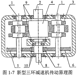 本文對(duì)三環(huán)減速機(jī)的平衡、均載減振方面進(jìn)行了深入細(xì)致的研究,并在此基礎(chǔ)上,提出慣性力、慣性力偶矩理論上完全平衡的兩級(jí)三環(huán)減速器一中間環(huán)板的厚度是兩側(cè)環(huán)板厚度的兩倍,并且它們偏心之間的相位差為180°;它的傳動(dòng)原理如圖1-7所示,三環(huán)減速器二級(jí)傳動(dòng)由兩根高速偏心輸入軸1,低速輸出軸2,三片內(nèi)齒環(huán)板3和外齒輪4構(gòu)成。為了克服偏心輸入軸的死點(diǎn)位置和增大傳動(dòng)比和降低二級(jí)輸入軸的轉(zhuǎn)速,一級(jí)傳動(dòng)采用分流定軸齒輪5、6分別帶動(dòng)兩個(gè)偏心輸入軸,而齒輪5、6則由一級(jí)輸入軸上的主動(dòng)齒輪7帶動(dòng)。三個(gè)內(nèi)齒環(huán)板都與外齒輪4相嚙合。在三環(huán)減速器的輸出軸2以及一級(jí)輸入軸8的軸承外圈和軸承座孔之間裝有輸出軸彈性均載環(huán)9和輸入軸彈性均載環(huán)10,彈性均載環(huán)的變形使輸出軸和一級(jí)輸入軸上的外齒輪浮動(dòng),補(bǔ)償制造安裝誤差和傳動(dòng)變形,從而實(shí)現(xiàn)三環(huán)減速器的均載和減振。對(duì)未加裝均載裝置的兩級(jí)三環(huán)減速機(jī)(以下簡(jiǎn)稱原型機(jī))和加裝均載裝置的兩級(jí)三環(huán)減速機(jī)(以下簡(jiǎn)稱改進(jìn)型機(jī))進(jìn)行傳動(dòng)性能、受力性能、均載和減振實(shí)驗(yàn),驗(yàn)證均載和減振效果,證實(shí)本文的三環(huán)減速機(jī)的優(yōu)越性。