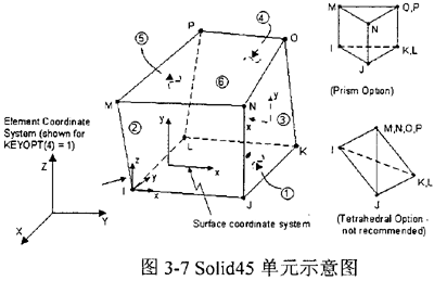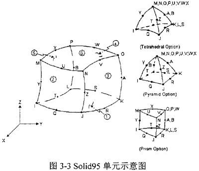 根據(jù)問題的性質(zhì)和模型的復(fù)雜程度,選用Solid95單元(見圖3-3)。該單元是三維的20個節(jié)點的結(jié)構(gòu)單元,可以在保證計算精度的前提下允許實體中不規(guī)則的形狀存在。每個節(jié)點存在三個自由度:X、Y和Z方向的移動,可應(yīng)用于塑性、脆性、大變形和大應(yīng)變等問題。