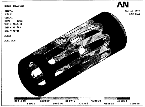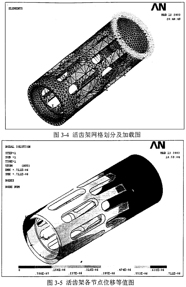 3.3.2.1 活齒架的強(qiáng)度分析 采用平臺為Pentium IV 1.7GHz CPU 、128MDDR SDRAM內(nèi)存、NVIDIA Geforce2 MX/MX4OO顯卡、Windows XP操作系統(tǒng)和ANSYS5.7 軟件進(jìn)行分析求解。