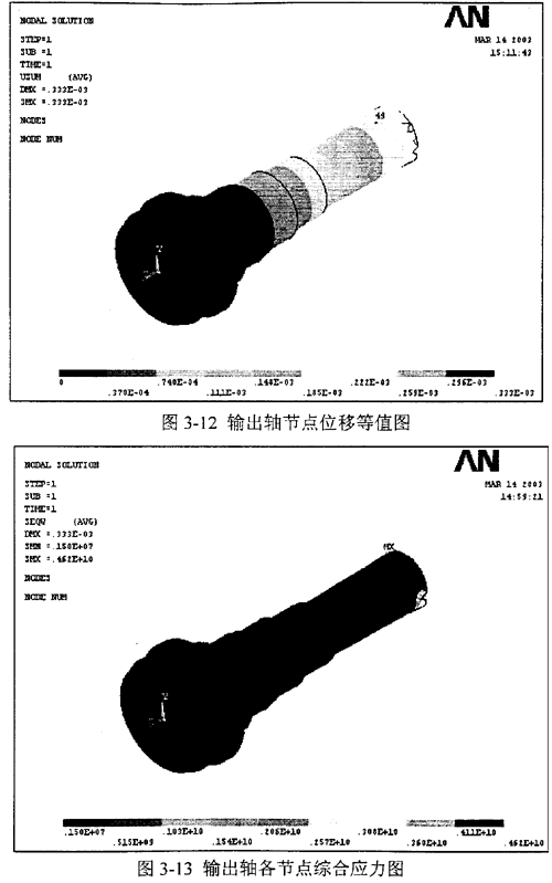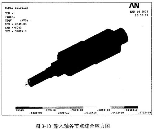 同樣,輸出軸劃分網(wǎng)格并加載后見圖3-11,各節(jié)點位移圖和綜合應(yīng)力圖分別見圖3-12和圖3-13。查詢可知輸出軸了大位移在節(jié)點49處,位移值為0.333mm。平均綜合應(yīng)力為1.5MN/mm2,遠(yuǎn)小于許用應(yīng)力。