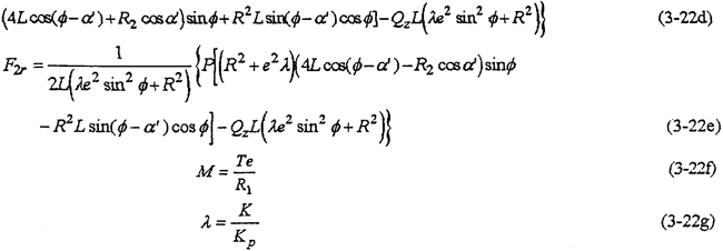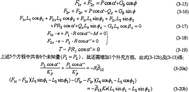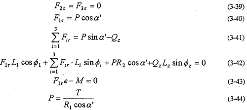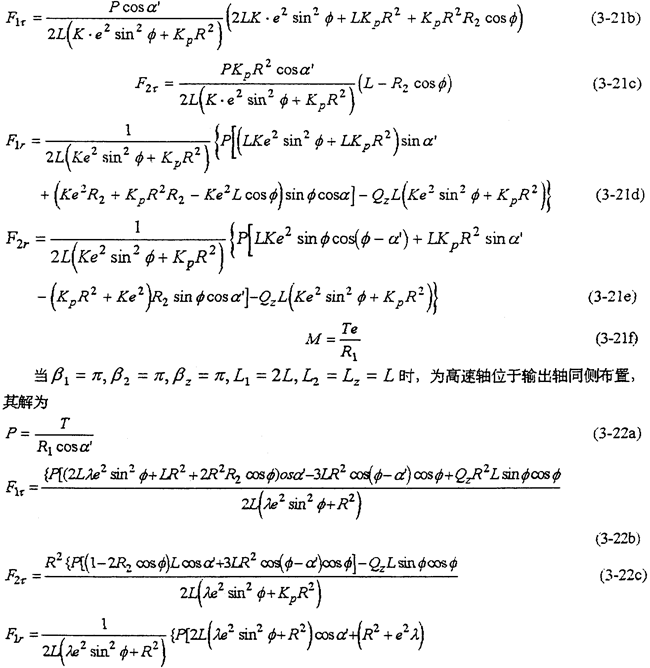 由方程式(3-15)~(3-19)和(3-20)可以完全確定雙軸輸入式的一齒環內齒行星傳動機構的動力參數。各動力參數中除嚙合力只與負載大小有關外,其余載荷均與傳動機構的幾何參數L1,L2,β1,β2,R1,R2,α′,α″等因素有關。故可以通過調整這些參數,以達到滿足結構、載荷要求。