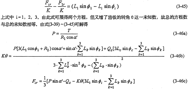 該機構的靜不定次數S=1,故需增加一個補充方程,才能完全確定機構的各動力參數。由齒板位移協調方程式(3-14)得