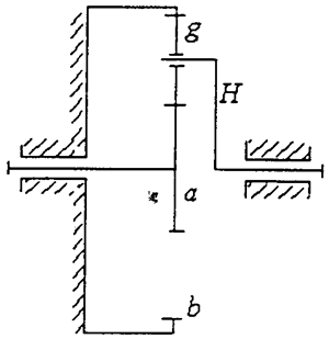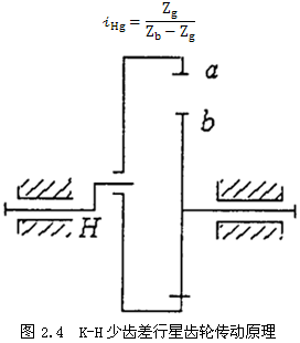平行軸擺線針輪的基本原理是K-H少齒差行星齒輪傳動原理,見圖2.4,它應(yīng)用2.1中結(jié)構(gòu)形式,將平行雙曲柄四桿機(jī)構(gòu)的曲柄,α是連桿內(nèi)齒輪,b是定軸輸出外齒輪。其傳動比為: