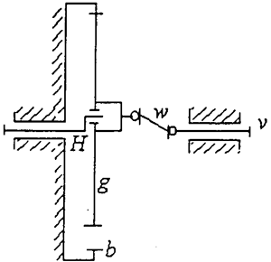 由公式(2-1)可知,在徑向尺寸受到一定的限制時(shí),要獲得較大的傳動比,必須減少中心輪Za的齒數(shù)。但Za受到最小根切齒數(shù)的限制,不能太小。因此,為了獨(dú)得較大的傳動比,人們把行星輪加大,甚至完全去掉中心輪,于是演變出行星齒輪傳動的另一種形式:K-H-V行星齒輪傳動,其結(jié)構(gòu)圖見2-2所示。它的基本構(gòu)件中心輪b、轉(zhuǎn)臂H和構(gòu)件V,當(dāng)中心輪固定,轉(zhuǎn)臂為主動,構(gòu)件V從動時(shí),傳動比為: